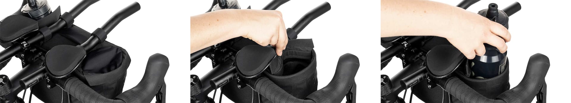 An easy-access, convertible storage space that fits directly to either regular handlebars or aerobars.