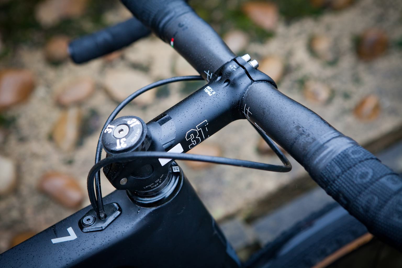 The bars are 3T’s Superghiaia Team flared drops. They are 44cm wide at the tops with an outward sweeping flare. Oh, and they are £300. A bit of cash is saved with a 3T Arx II alloy stem (£95). Finally, the wheels are 3T Discus Plus 650b alloy (£850).