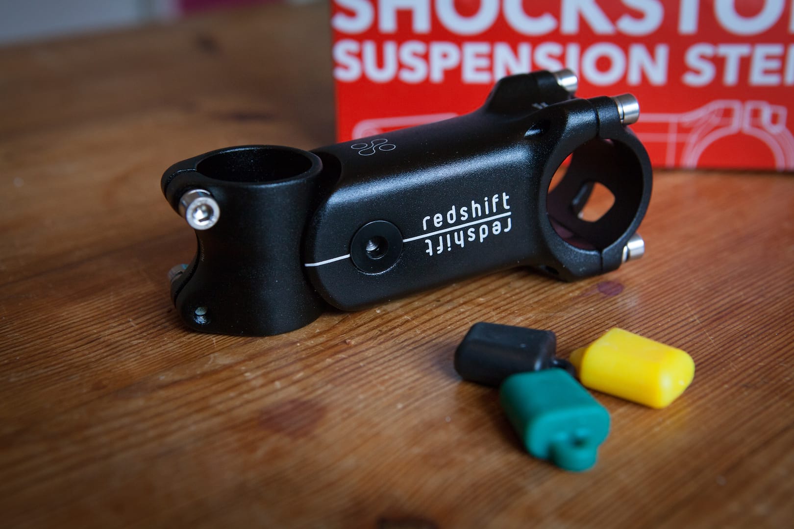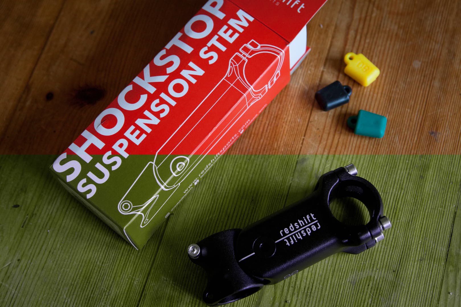 The ShockStop is a pivoting stem, which uses elastomer inserts to dampen and smooth out hits from the road/trail. The effective travel depends somewhat on how far away your bars are from the pivot point (just in front of the steerer). A longer stem and drop bars stretch you further away and gives around 20mm of travel. A flat bar leaves you a little closer to the pivot and will give more like 10mm.
