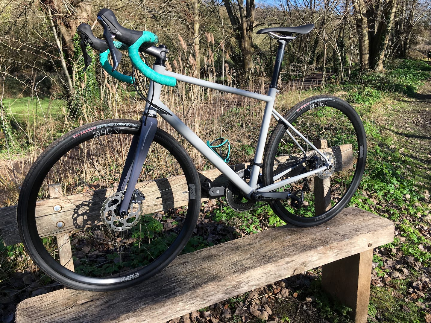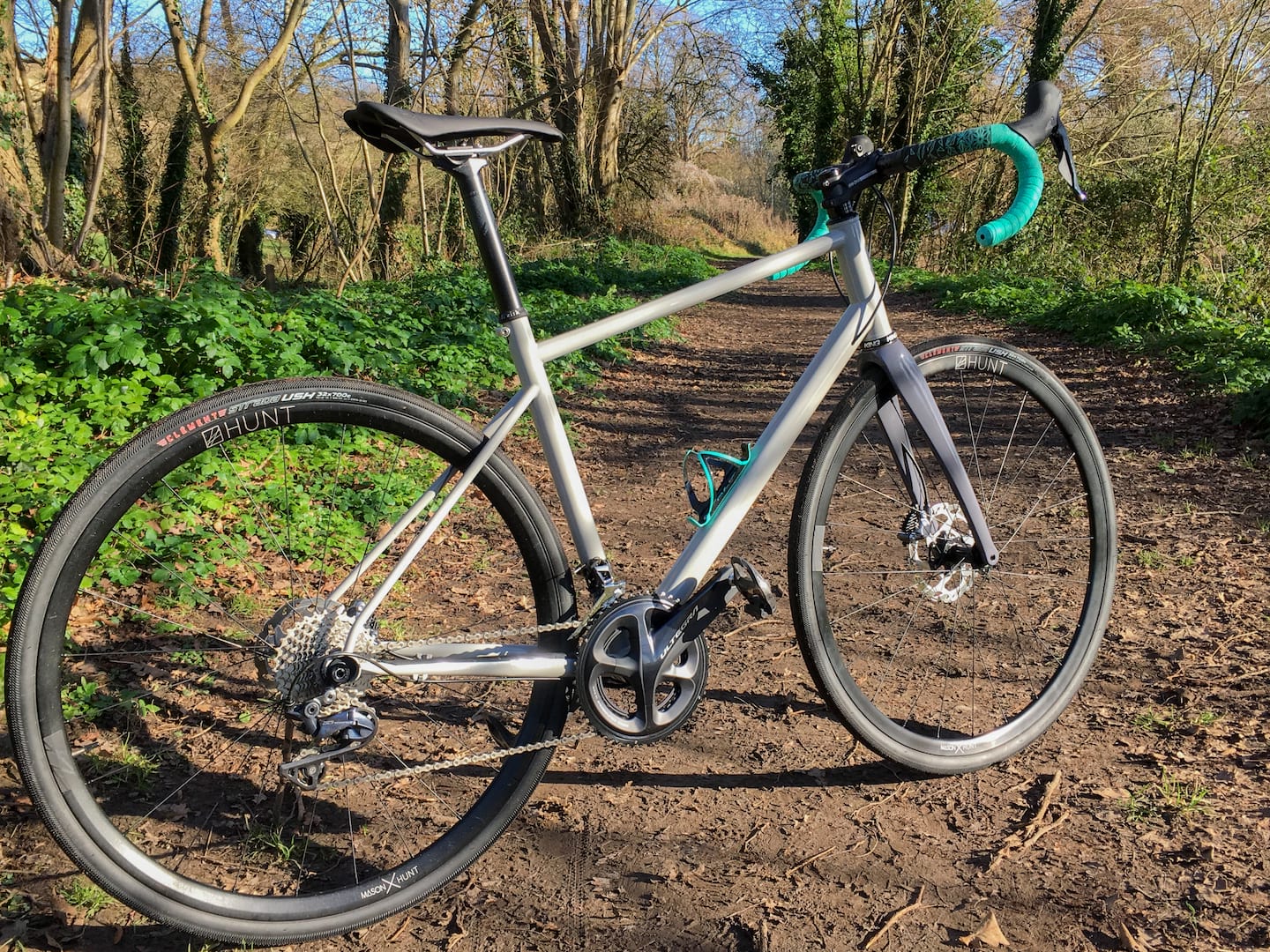 “Columbus Futura disc fork , Full Ultegra disc groupset, Chris king bottom bracket and headset, Hunt Mason X disc wheels, Easton EA70 seatpost, stem and gravel bar.”