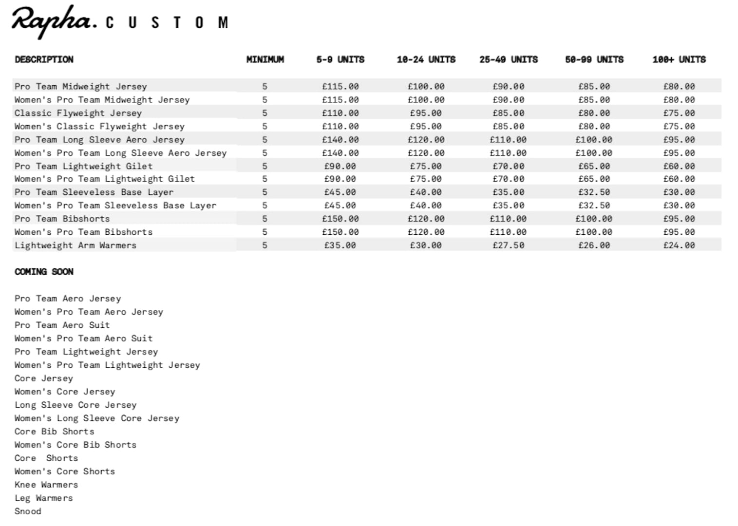 You don’t need a full pro-team size roster to be able to order. Quantities start from as low as five, but the larger the order, the cheaper it becomes. Discounts of up to 40% apply on large orders. Rapha Custom is designed to be accessible for everyone – from cycling clubs to businesses, or just a bunch of mates.