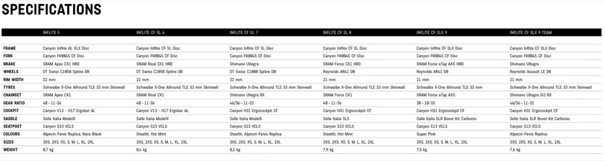 For this year, the Canyon Inflite comes in both carbon fibre and alloy, but there are no frame only options. The alloy model, at £1,499, is one build spec but with two colour options. If you go for carbon fibre, you get three build specs with Carbon CF SL, and two with the higher end Carbon CF SLX, which tops out at £4,199 for the Team edition. All bikes are available in a whopping eight sizes, from 3XS through to 2XL.