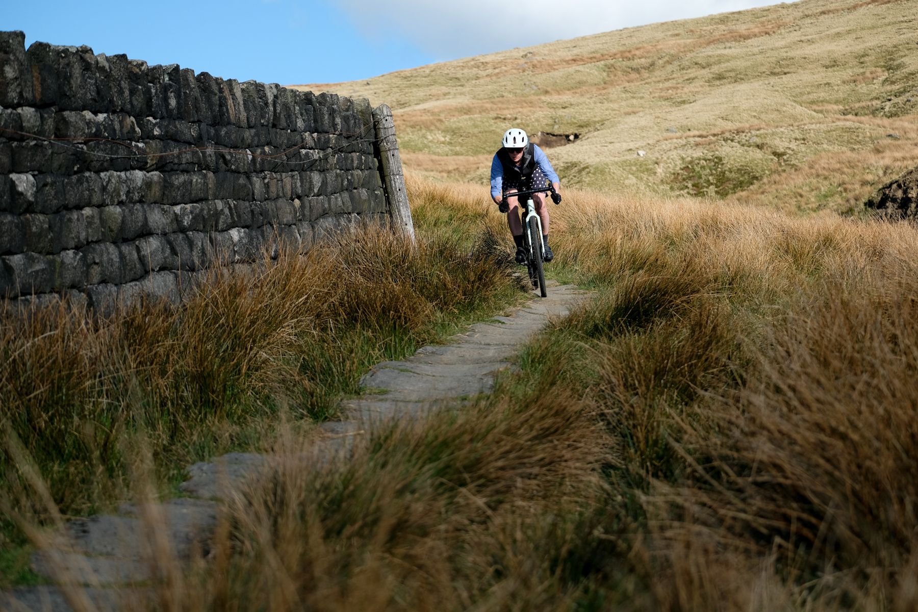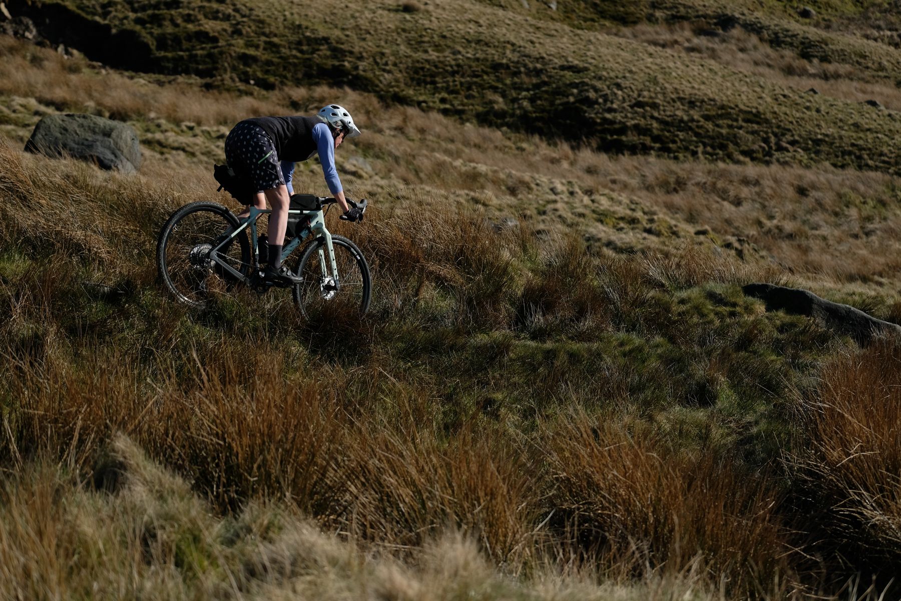 Indeed, the compact feel of the stock set up combined with the light weight and pleasing response to pedalling had me wishing for miles of North Downs Way or some other such less gruelling rock strewn terrain than the Calder Valley. For a fast spin out covering decent off-road mileage in a day, the Grizl would be great. I can really picture myself pedalling until lunch at a view point and cafe, chomping down on beans on toast and stashing a cake in my bento box on the top tube as an afternoon snack, then completing the ride at a pub somewhere not too far from home, extracting my jacket and beanie from the saddle pack as the sun goes down. I would definitely consider it as a bike for an event like the Dirty Reiver – though I’d perhaps like a bit of rubbery frame protection on the downtube for tackling fast and loose fire roads with all those pointy shale stones that the Forestry Commission seems to have got a bulk discount on.