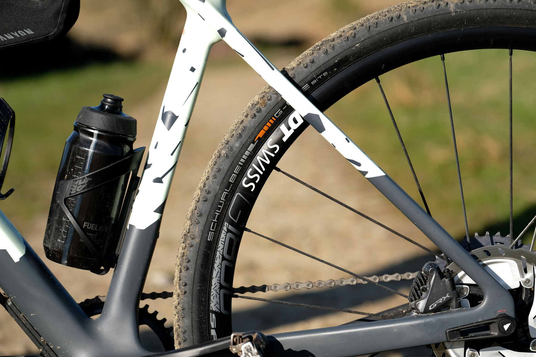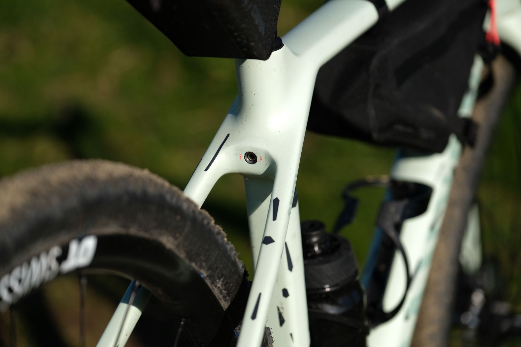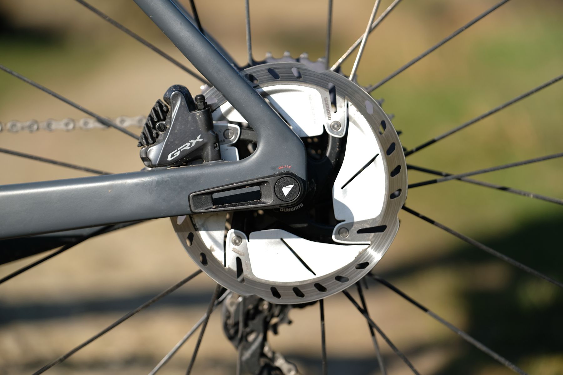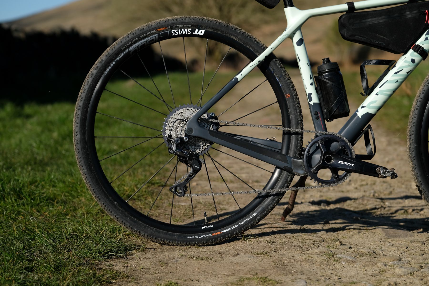 Wheels are size specific, with size 2XS and XS coming with 27.5in wheels and sizes S and up coming with 700C wheels. There’s room in the frame for up to 50mm tyres, though the bikes ship with 45mm Schwalbe G One Bite tyres at all spec levels – and this is the maximum width if you want to add mudguards. You can pick from top end electronic shifting from Campagnolo and Shimano, though there’s no SRAM with or without electronics (as yet, perhaps – there’s an Aluminium model due at some point, subject to 2021 supply shenanigans, so perhaps we may yet see a SRAM equipped model?). Eschew the lighter frame and electronics and you can pick from the Shimano 1x GRX 800 build we have here on test, or add a front derailleur on GRX 600 and 400 builds, or some women’s specific contact points.