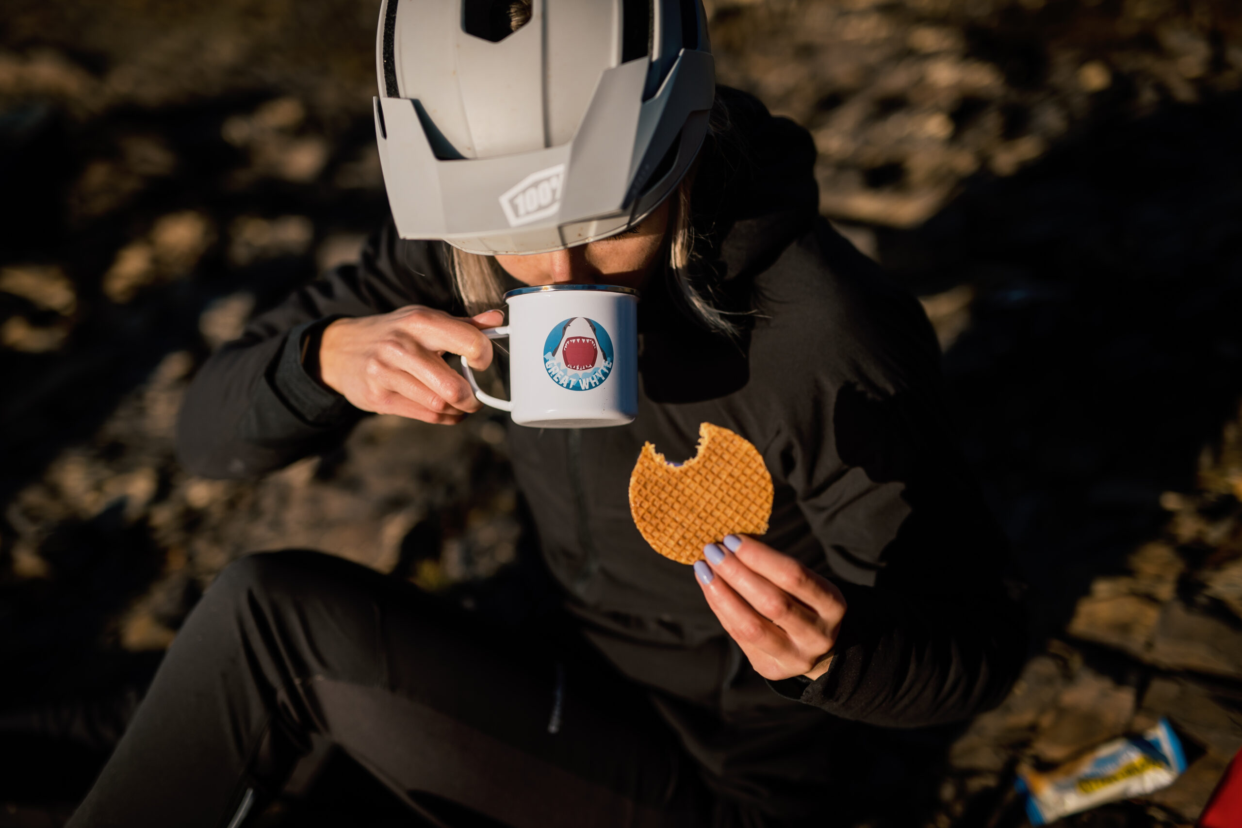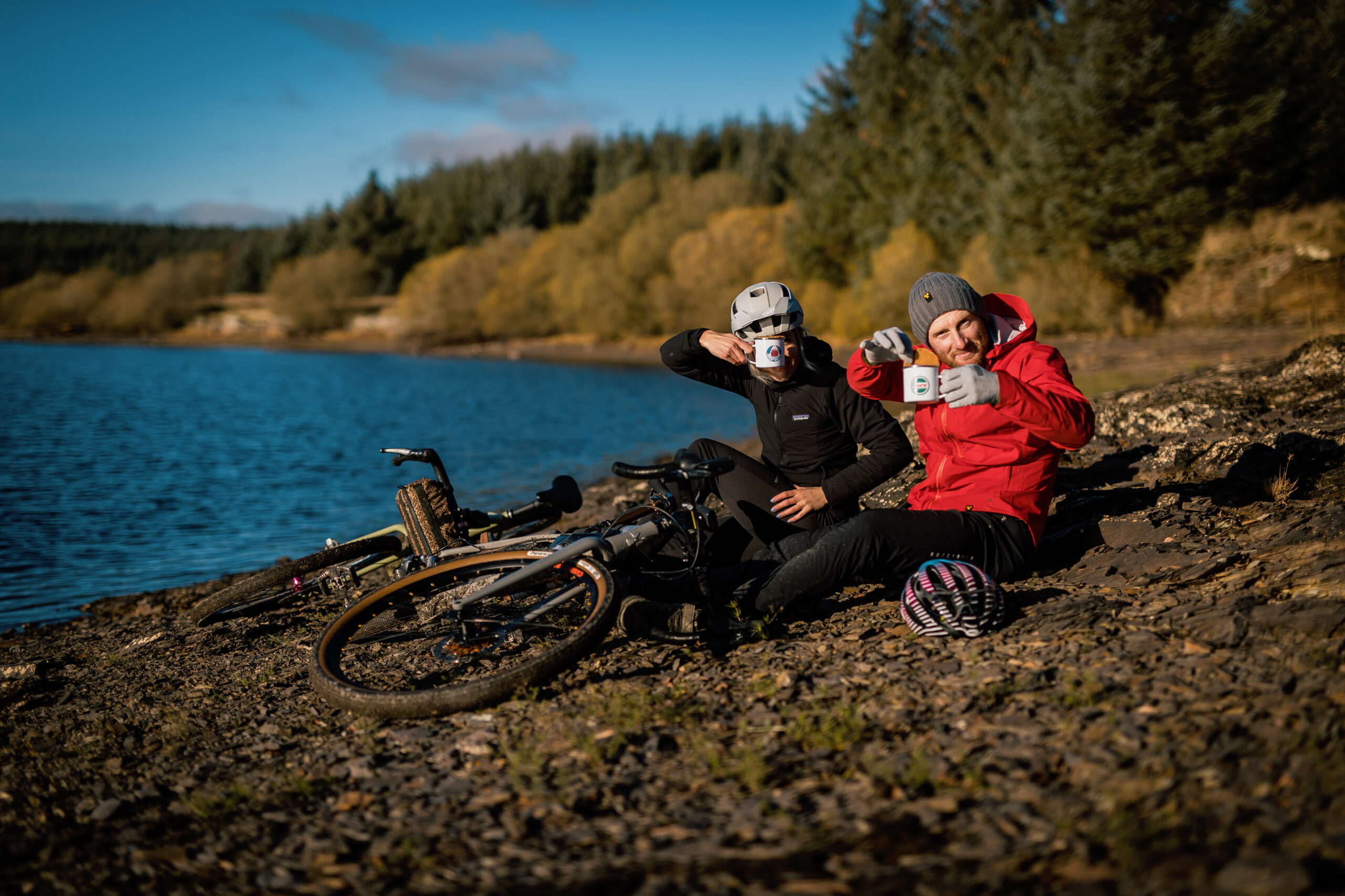 Turns out too in gravel, you stop when you want. Not like a normal mountain bike ride when I gasp for breath at the top of the climb before dropping into a trail, this is a much more civilised affair. Riding as a group all together, we’re chatting all sorts and simply taking in the awesome views, no thought to Strava times here (or at least not on this ride)! That is until there are a few downhill switch backs and Adam drops his saddle (yep we’re still mountain bikers and so a dropper post is essential). We’ve strapped some rad little packs to our frames and crammed in loads of goodness, so just over half-way round the ride we stop on one of the many pebble beaches and pull out a flask of coffee, proper mugs and some stroopwafel biscuits. Next level trail snacks.