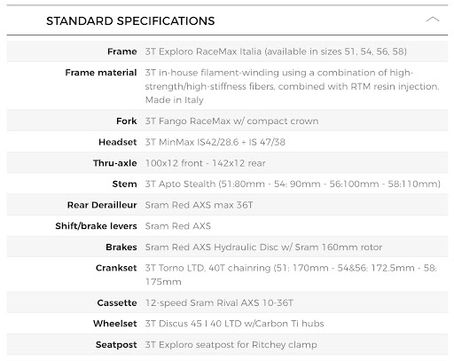 “Like Lamborghini super sports cars, the use of carbon fiber and lightweight materials is predominant. The Racemax frame, which is the beating at heart of the bike, is crafted in-house in Italy using 3T’s own carbon fiber technology. The 3T Torno®, the world’s lightest aero crank, is also made in-house using the same materials. Inspired by Lamborghini, titanium and aerospace-grade alloys and steel are also present on the bike parts and details.”