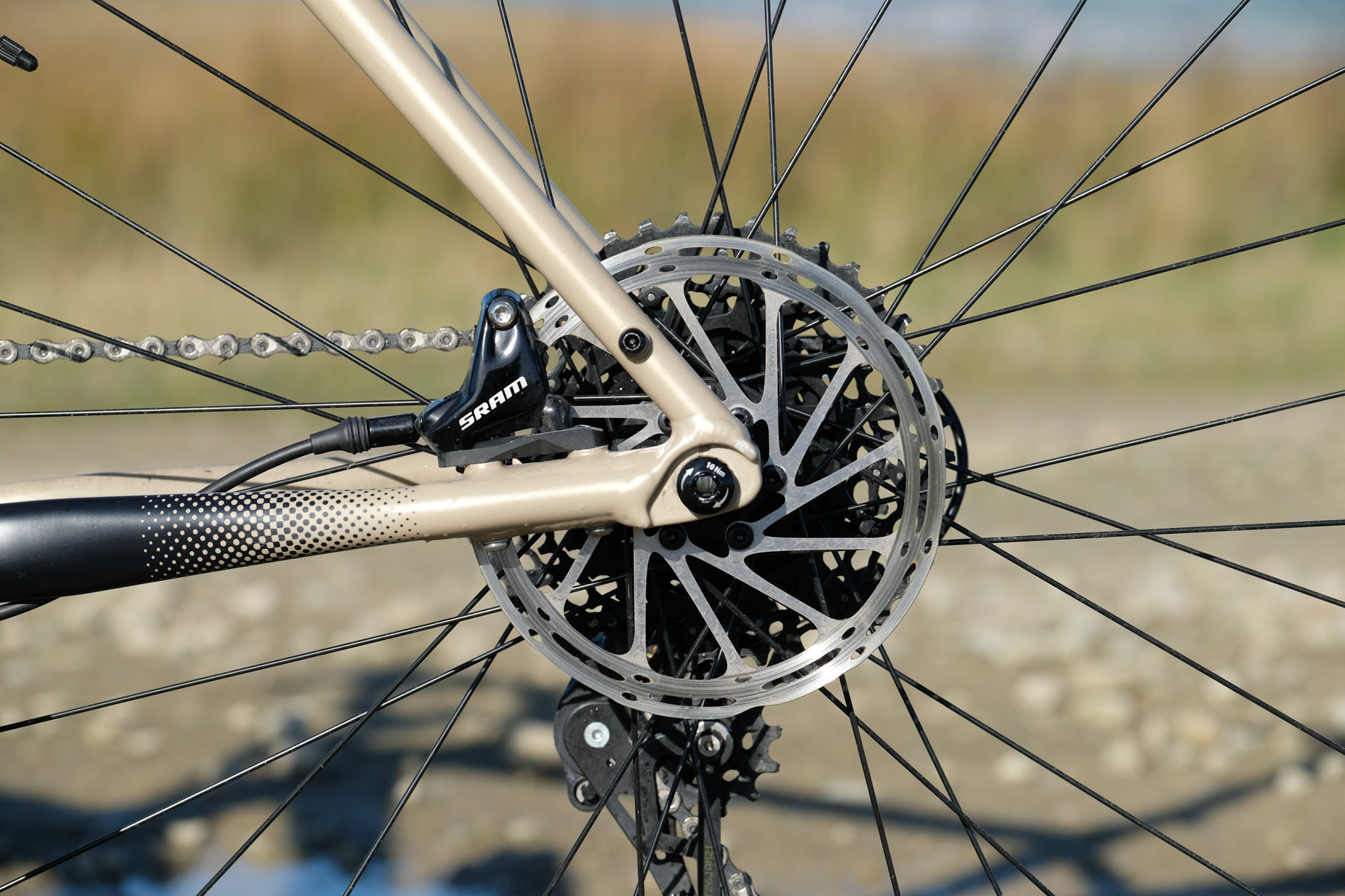 Braking performance from the road-spec twin piston calipers is OK. Not mindblowing, but they definitely work. I do sometimes get frustrated about the size of road groupset discs, pads and calipers as there tends to be a lot of braking to be done on long gravel descents. Something that can’t really be helped without the addition of suspension and flat bars.