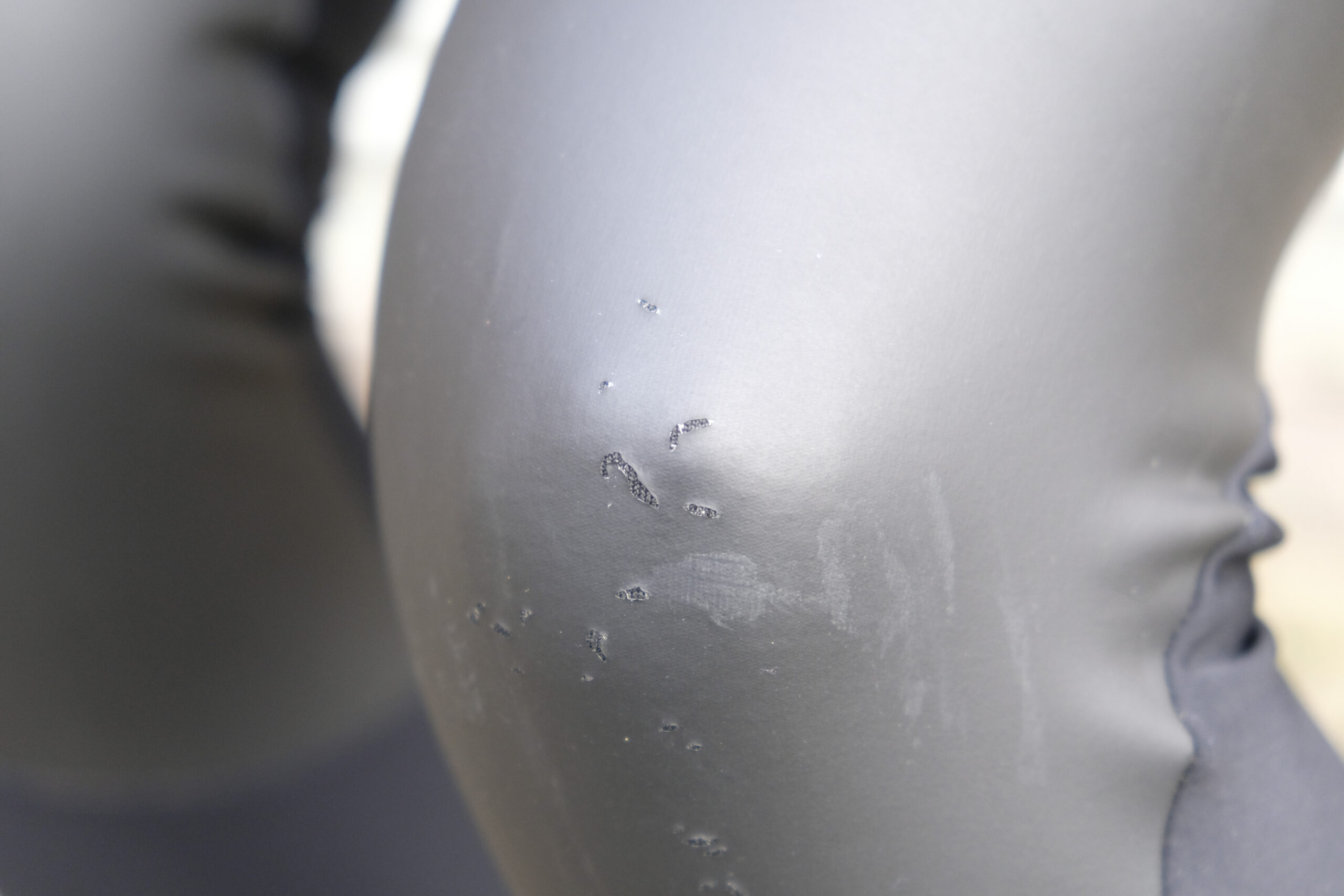 On the bike in Iceland, with a jersey and softshell over the top, I never once felt too cold or too sweaty. Even at temperatures around zero degrees, with plenty of wind, and an occasional rain shower, my temperature felt just right. With plenty of melt water on the ground to splash, the water resistant coating seemed to perform well, though it would perhaps be nice to have a ‘bum panel’ of the neoprene fabric. Concerns that the neoprene panels may prove fragile – I’ve seen similar fabrics in triathlon suits tear at the merest hint of a rocky beach – were put to the test went I crashed. Landing fairly hard on my knee in stoney gravel and icy slush, I could feel the briefly cool chill of a dampened leg, but there was no initial sign of any external damage to the fabric. Upon finishing the ride, there was a clear muddy tide mark, where the muddy water had seeped through the fabric sections, but not apparently through the neoprene. Grazes on my knee attested to my crash, but the leggings appeared no worse for wear. However, I must somehow have compromised them, because after going through the washing machine back in the UK I have found that the site of the crash now has small holes in it. Darn it. Except, darning isn’t really an option, is it. Darn it.