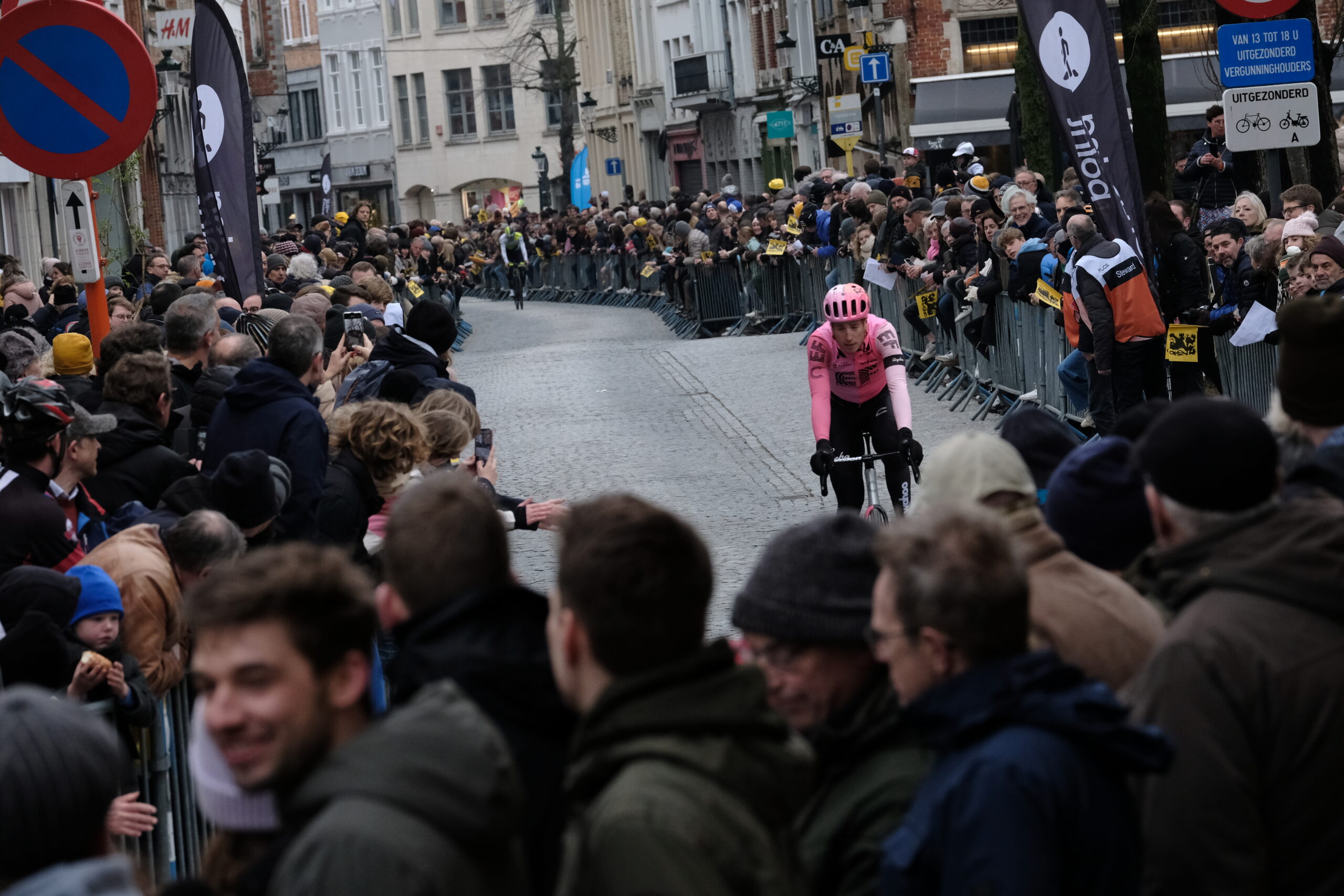 After checking out the bikes for sign-on, we whizzed off to another couple of spots on the way. The first, a gradual tarmac climb with a cobbled descent, was also a feed station, so many riders were munching on snacks and joking around rather than in full pursuit. That, however, all changed by the time we got to the Molenberg. This steep, narrow, cobbled climb sits in a hollow, so riders have no option but to keep to the cobbled crown, away from the greasier verges.