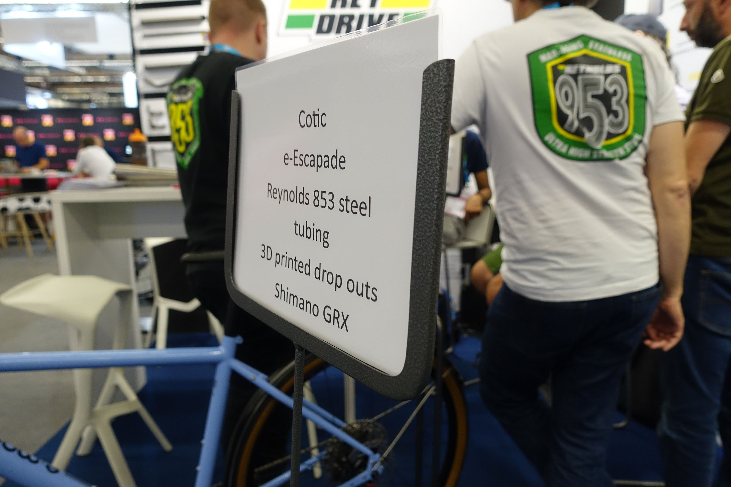 I’m not sure if this should be here in grit.cx or in Singletrack Charged. But it has drop bars, so it’s going here. Cotic teased an electric gravel bike concept on the Reynolds booth. It seemed to be less about e-Cotics and more about Reynolds’ ability to 3D print dropouts for such a project. As Cy Turner said: “