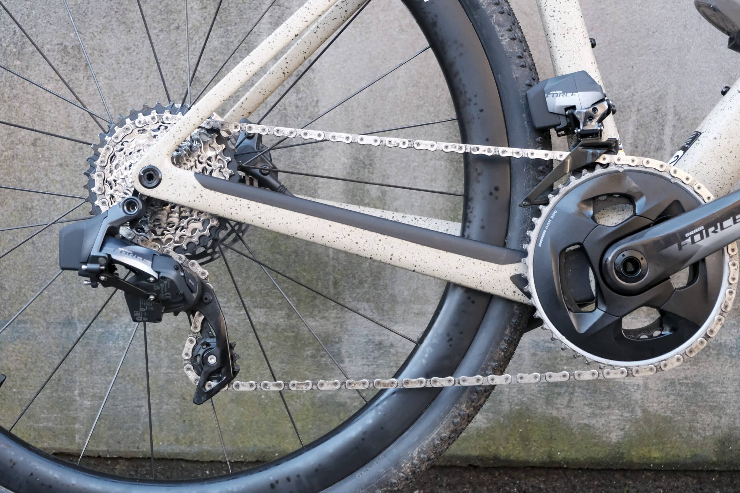 The double chainring drivetrain [SRAM FORCE eTap AXS 24-Speed, 10-36 with 46/33T] feels like a conservative decision on a bike like this. Something so obviously suited to the rapidly emerging gravel racing scene would surely have been better off with a good size single ring, maybe keep the 46t big ring it currently has and have a 10-52t cassette out back. This gives near identical top and bottom gear ratios as the current 33-46t chainrings and 10-36t but with less filler ratios in between and significantly more front chainring security. I also don’t think I’d want to do first hand research of the unreliability of SRAM front shifting that I’ve heard about from various sources – that’s speculation on my part though.