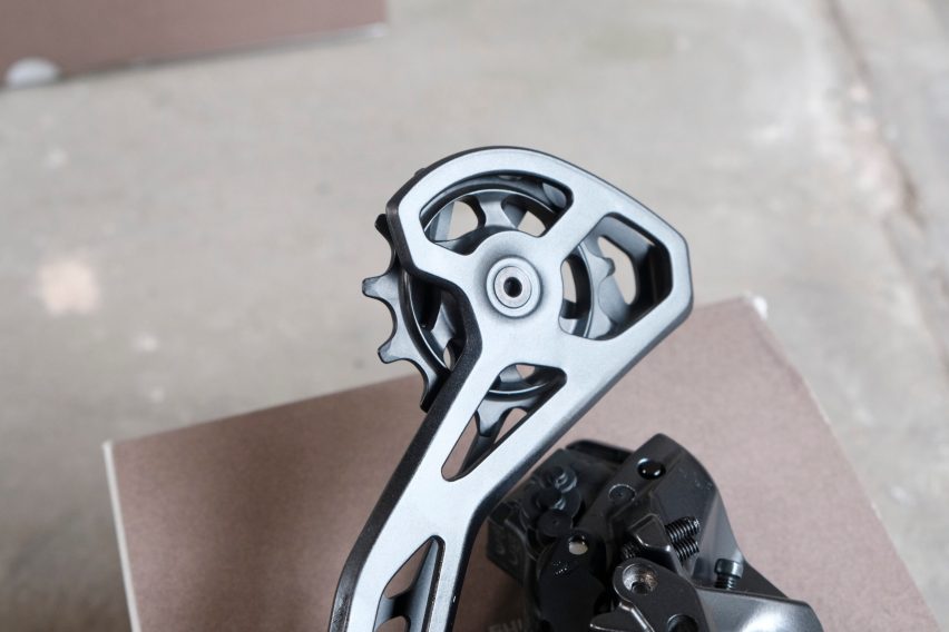 Like on Shimano’s road 12-speed Di2 systems, the rear derailleur is also the communication hub of the drivetrain, communicating wirelessly with the shift levers, compatible cycle computers, and E-TUBE PROJECT Cyclist via a smartphone. It also houses the system’s charge port and the multi-function button which allows riders to easily check battery level, pair via Bluetooth, and enter adjustment mode for both derailleurs.