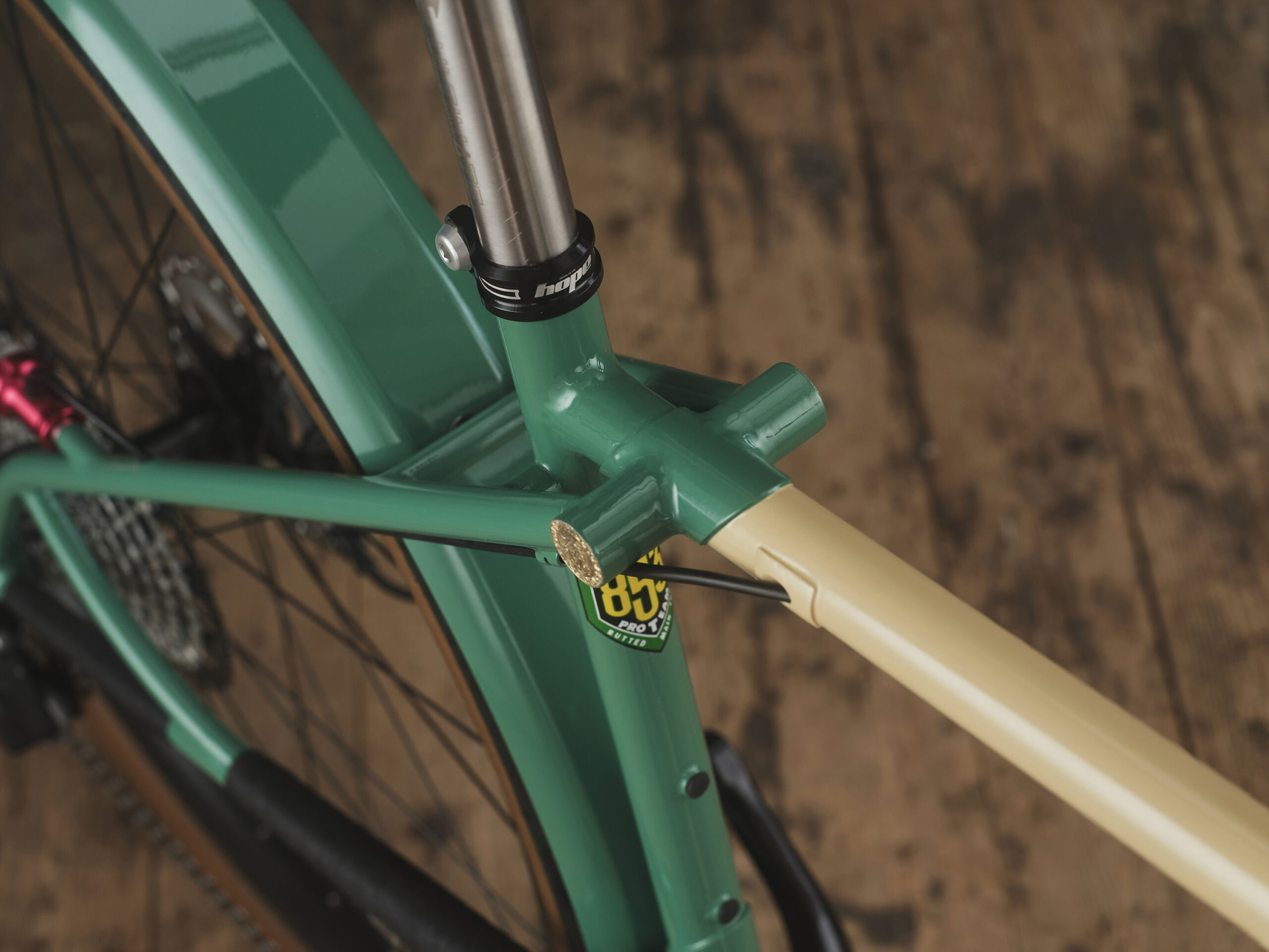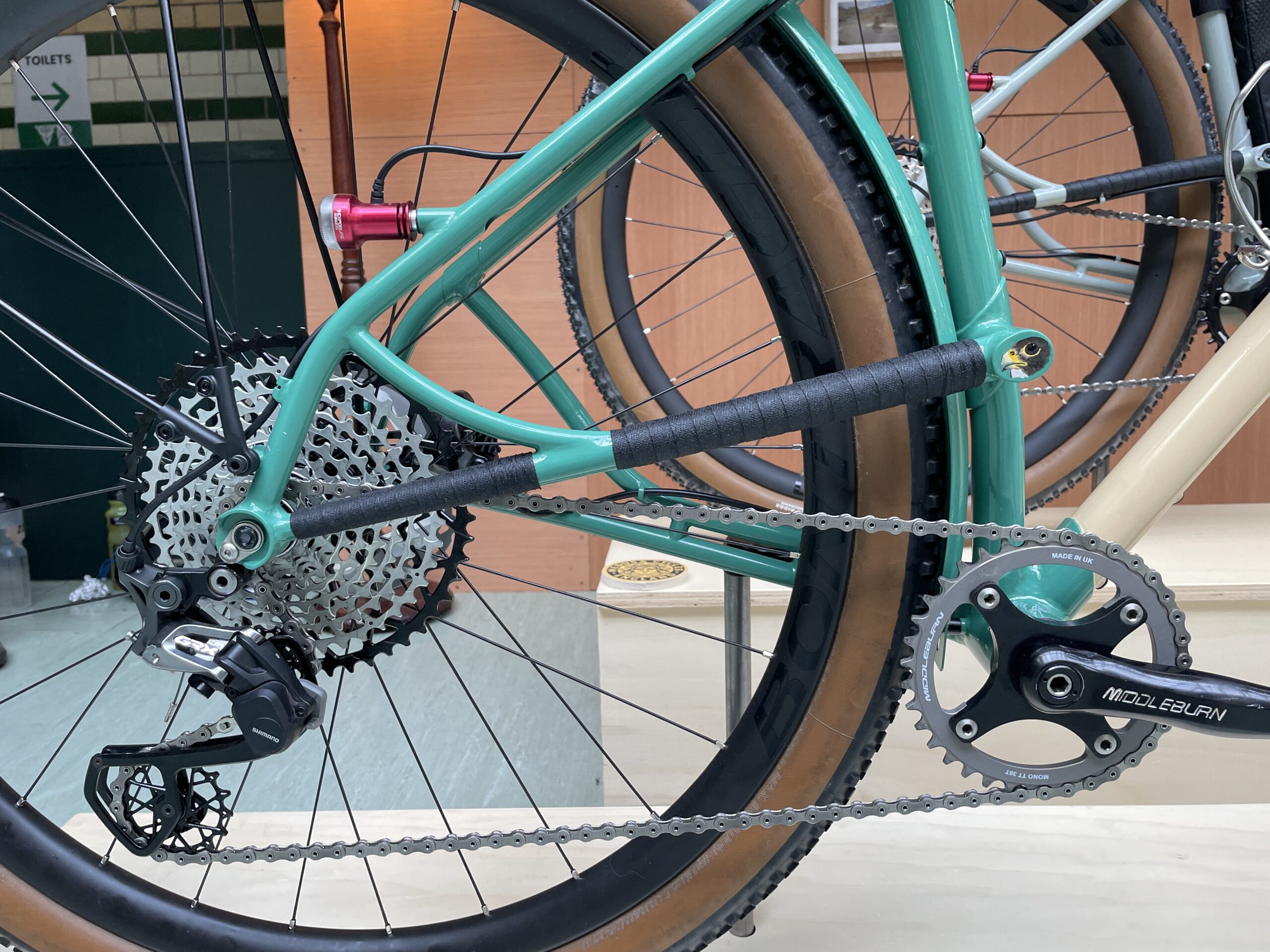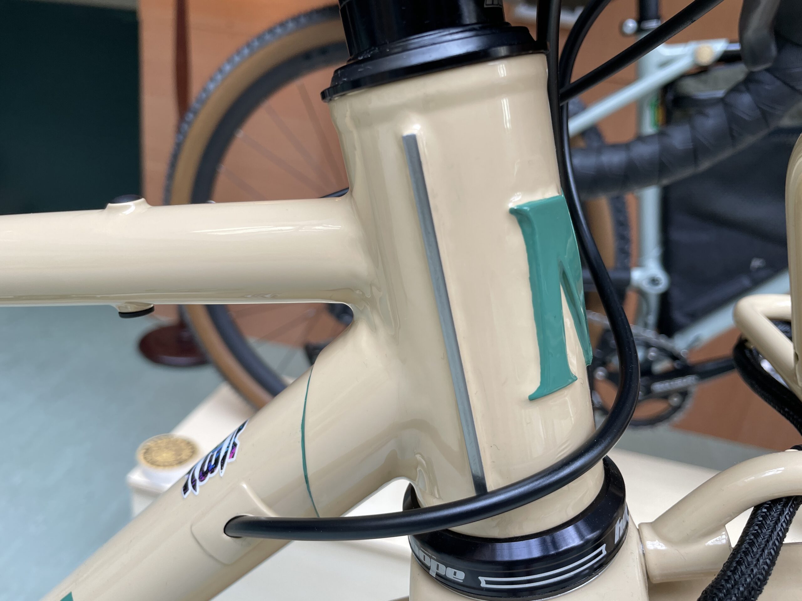 I’m a mechanic as well, I don’t just do this – yet. I’m not making any money yet, as pretty much with everyone else here, I would have thought. I’m also a full-time mechanic, and the bain of my life is bikes that aren’t routed, or got good enough routing solutions, so I’ve spent a bit of time getting the stainless tube in there just to make things easier. I chose the same sort of thing with the brake line routing and the shift outer there.