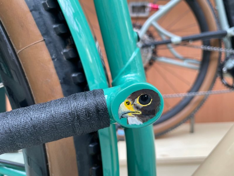 It’s basically, you’ll see the beer mats here, it’s that same design, if you look closely you’ll see it’s the same thing. And then again here, where the chainstay attaches, I didn’t just want a flat bit of empty space. I’ve done a lot of painting by trade in various forms, and I thought that was an excuse just to put a little painting on there.