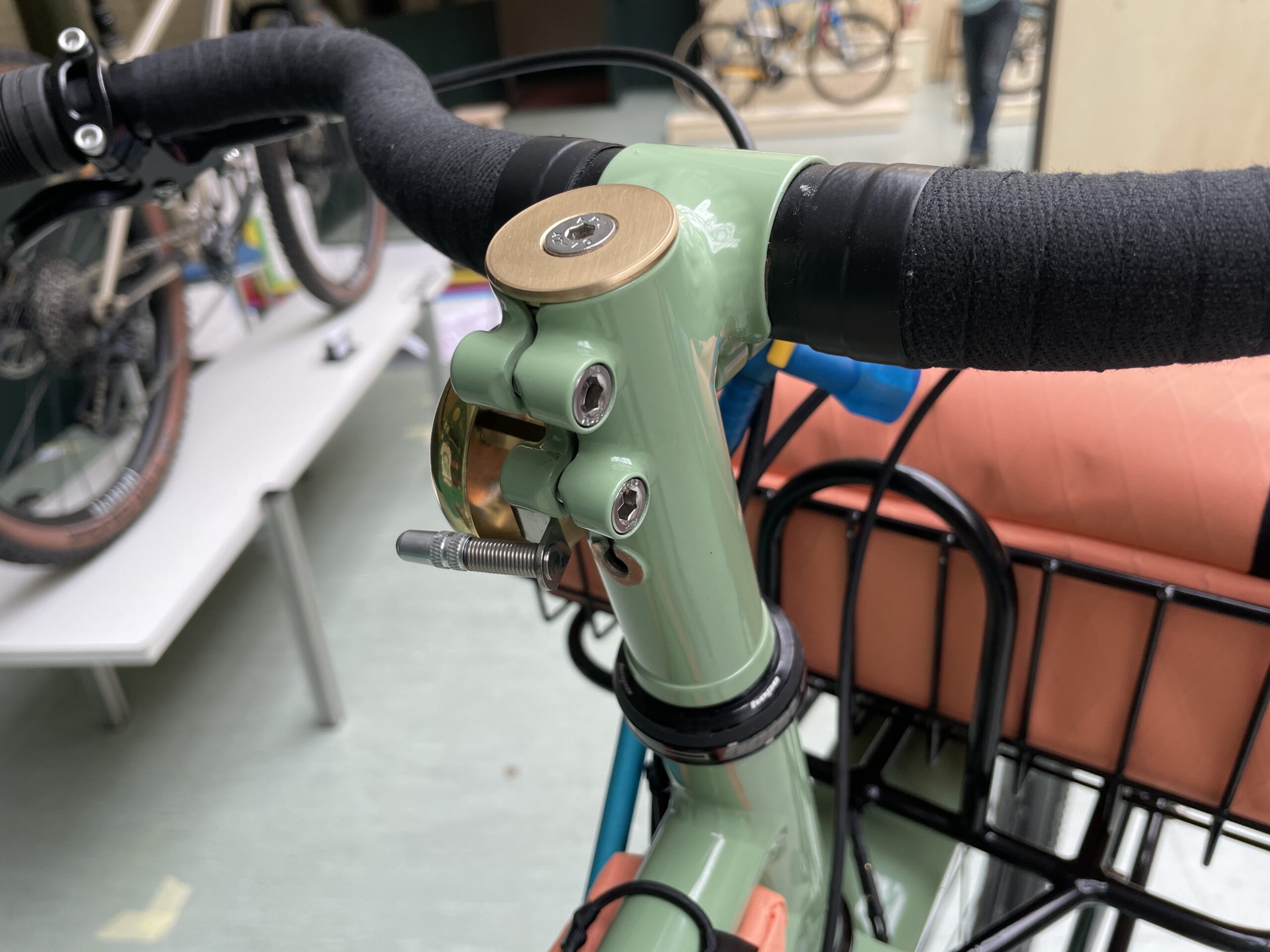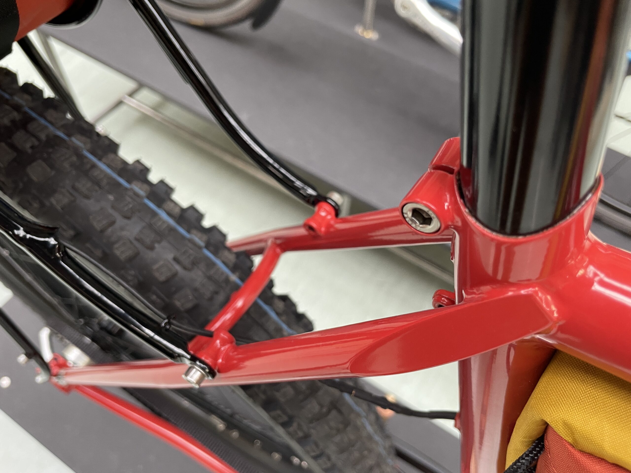 The four biplane fork crown thing was because on the original one I built, my jig at that point couldn’t do a chainstay length long enough. So I made it as a fork sort of sub-assembly, as a way of manufacturing it, but I really like the aesthetic of it, and this customer really wanted to like carry that through. All my bikes have the twin plate fork crowns, so referencing that at the back of the bike is fun too.
