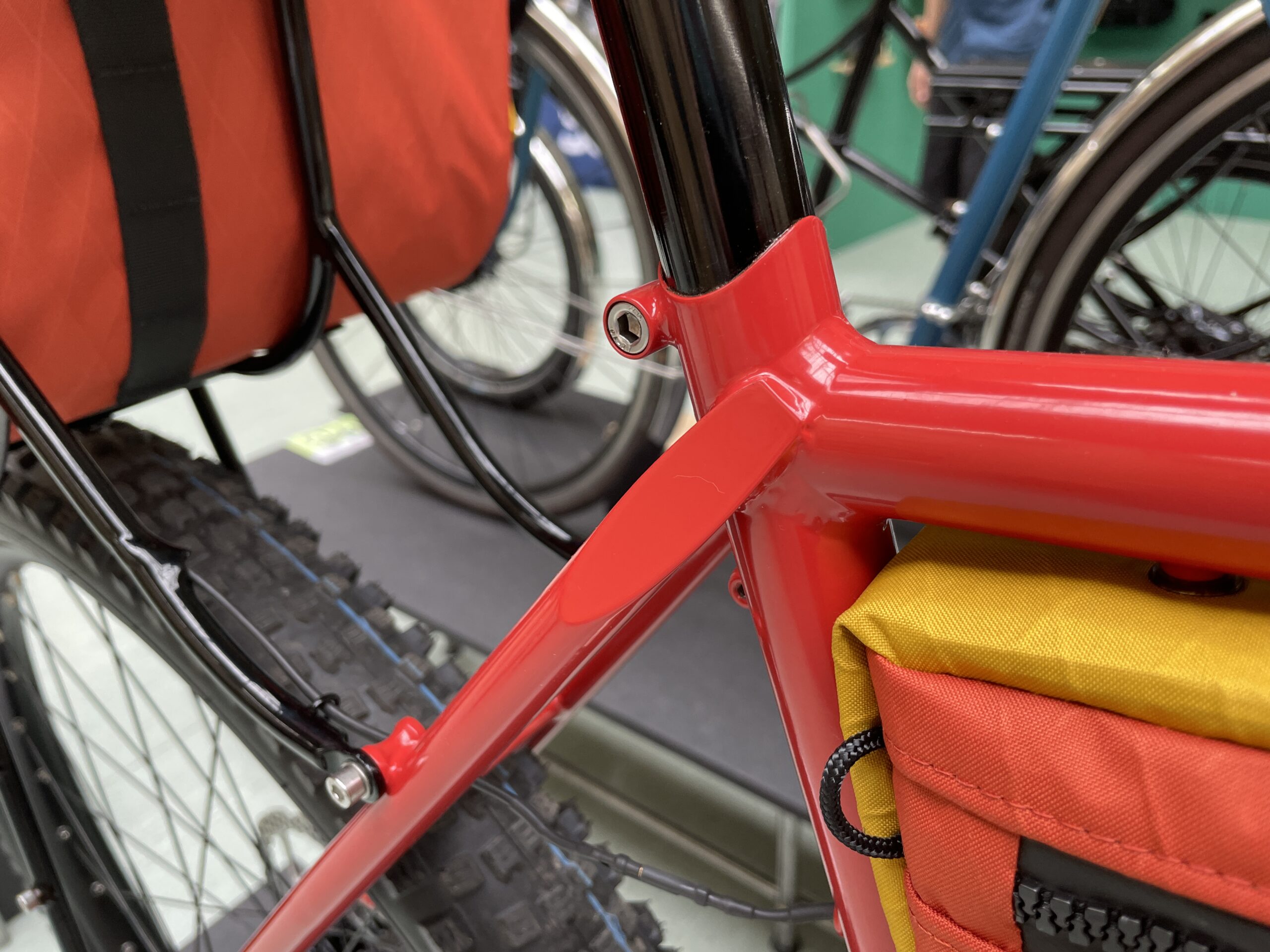 Yeah, this is a Carrier, which is my kind of ‘standard model’. It’s a kind of on-off-road touring bike, commuting bike, gravelly kind of thing. They’re all built custom-sized and made to order, and built with up to a 2.6 inch tyre, or a 2.2 with mudguards. I made them so they’ve got perfect mudguard mounting, so there’s no spacers, you just bolt it straight on, and the mudguards bolt to the racks as well, so they’re super rigid, no rattles, and really easy to live with.