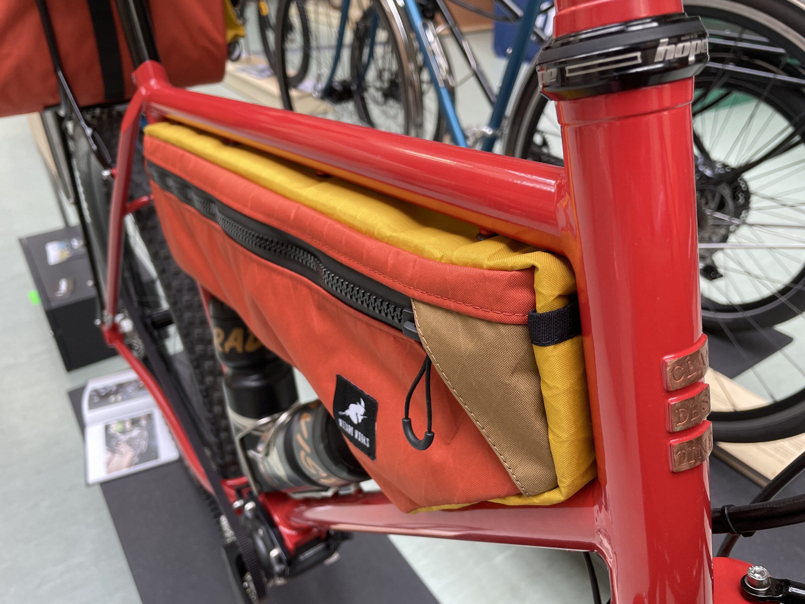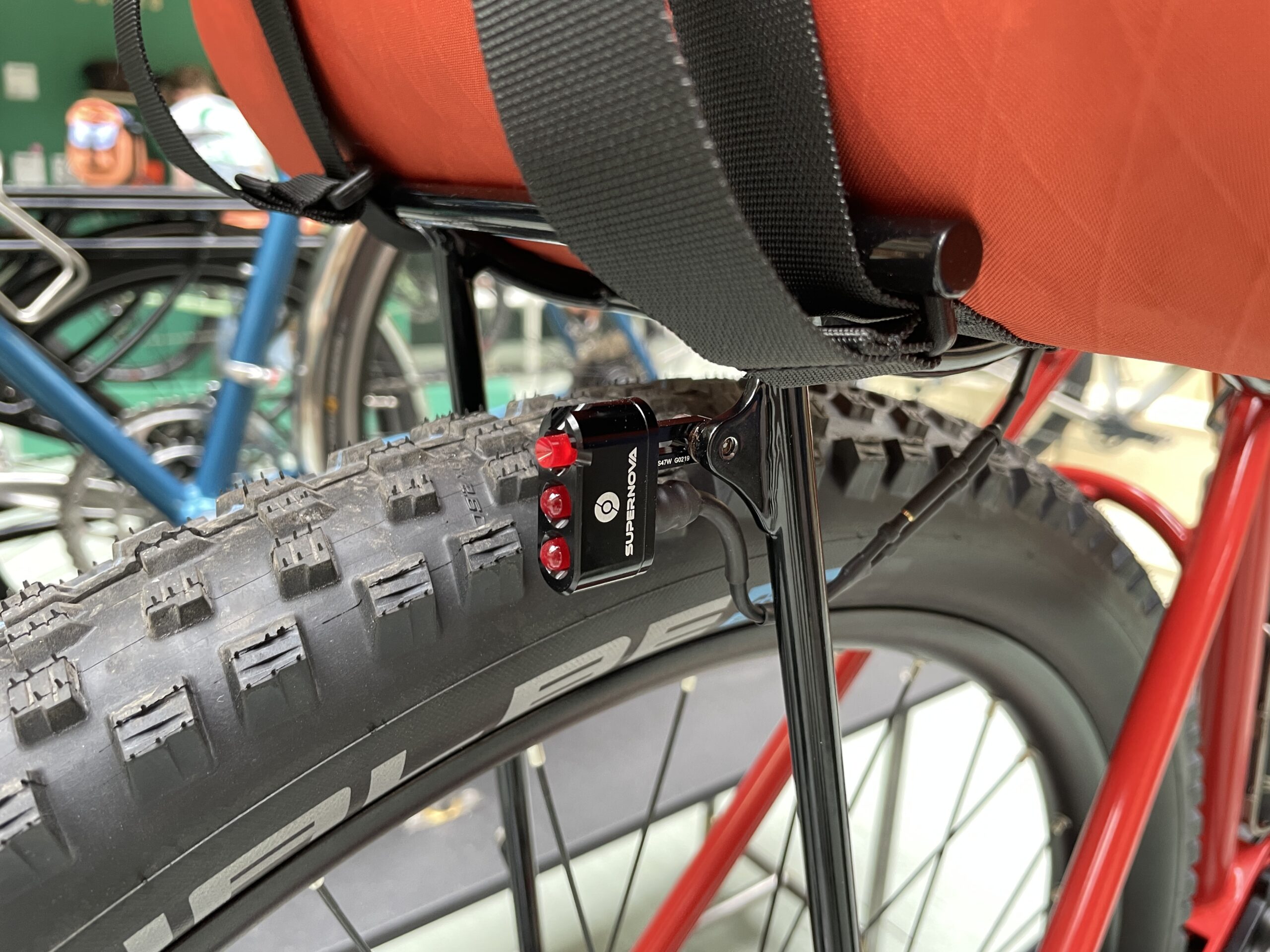 Yeah, the racks are all made by me, and they work perfectly with the bags. The rear one’s designed around the WizardWorks Shazam bag, and it’s got triple boss mounts on the fork legs for more water bottles or bottom bags. It’s also got eyelets for a Volle strap, so you can strap a dry bag there with like a stove in or something.