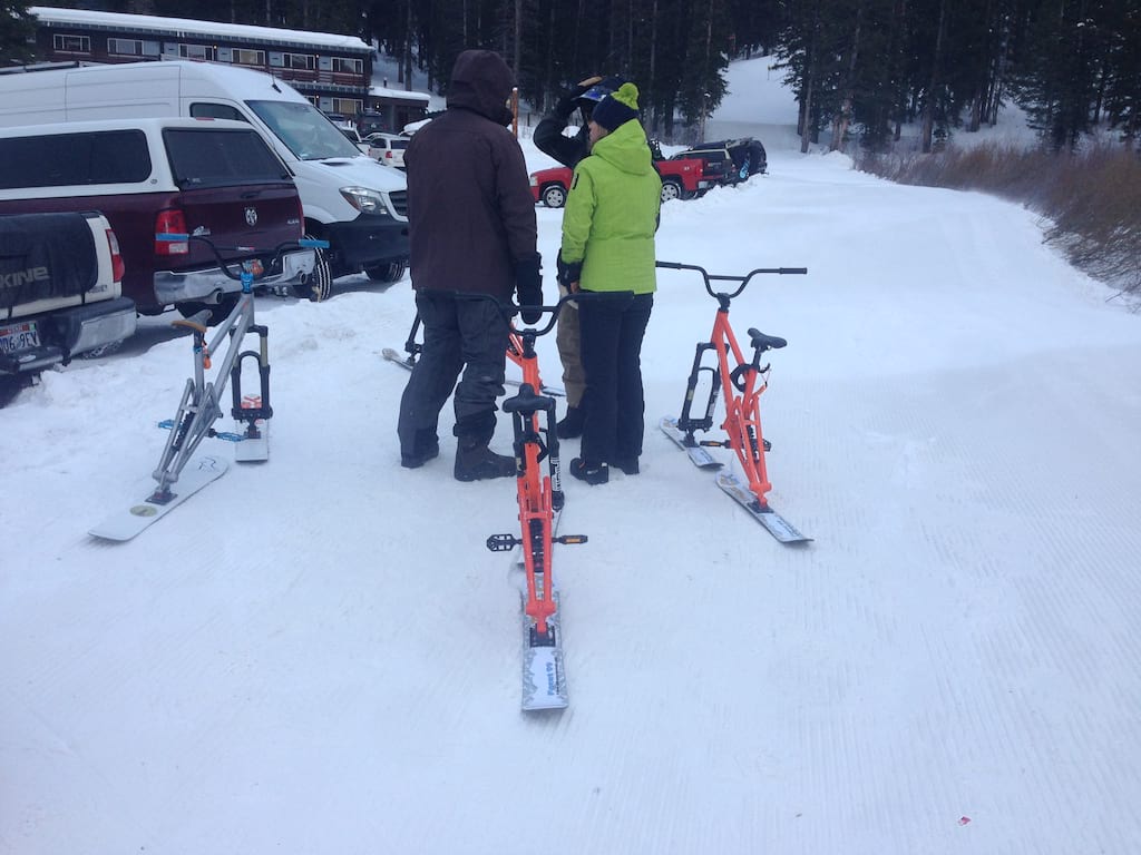 When standing, turns are initiated either through the handlebar or with the hips and legs, or both and can include counter-steer techniques, especially on steeper terrain. This venture was my third time on a ski bike and the first time that I had gotten more than 2 runs, so I would say that an MTB background is very helpful but, so is a ski or snowboard background. Have a mix of those, all the better, because unlike MTB the ski bike is almost always in a skidding turn, never really hooked up, catch my drift? So, I found my ski and snowboard anticipation (what is this skidding arc going to look like) and turning style to be useful, particularly around others and in trees. On the other hand, the stance was very MTB making terrain reading, jumping and rolling steeps, very familiar. I can pretty confidently say that if you are a regular MTBer, it should be possible to be riding (and probably some crashing) on blues/intermediate the first day. While not my first day, I was able to ride black/expert runs successfully but, I think I owe much of that to having an instructor with me to steepen and shorten the learning curve. Your results may vary, but I’m pretty sure you’ll pick it up quickly and it will make you smile, want to ride your wheeled bike and improve your riding.