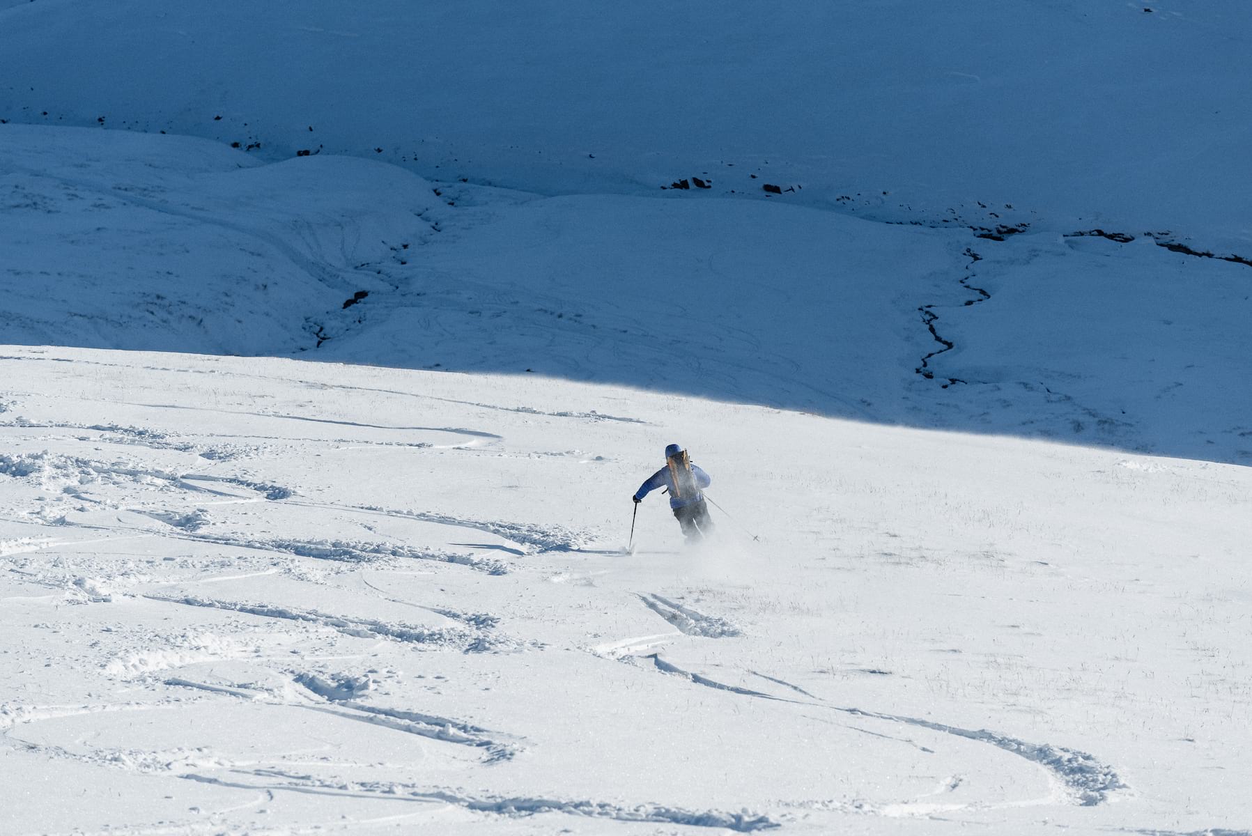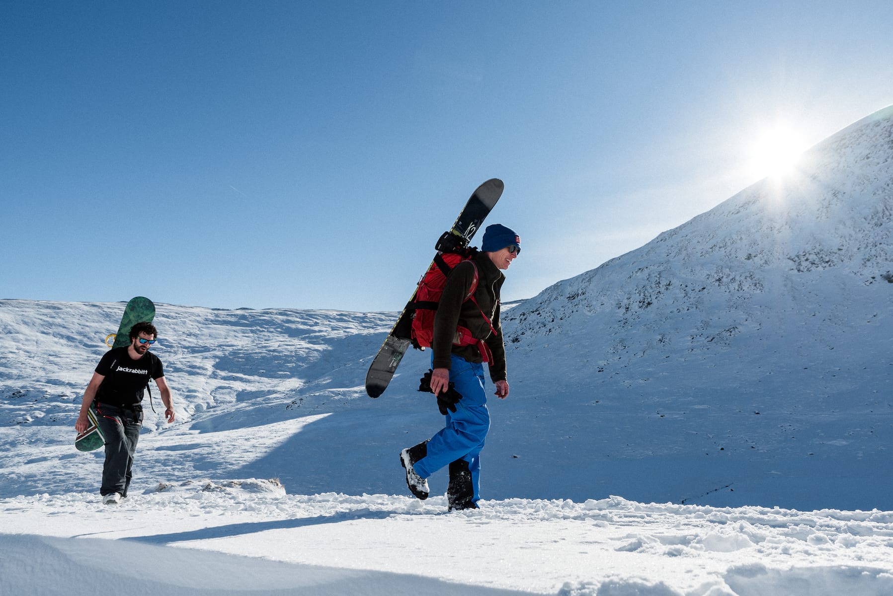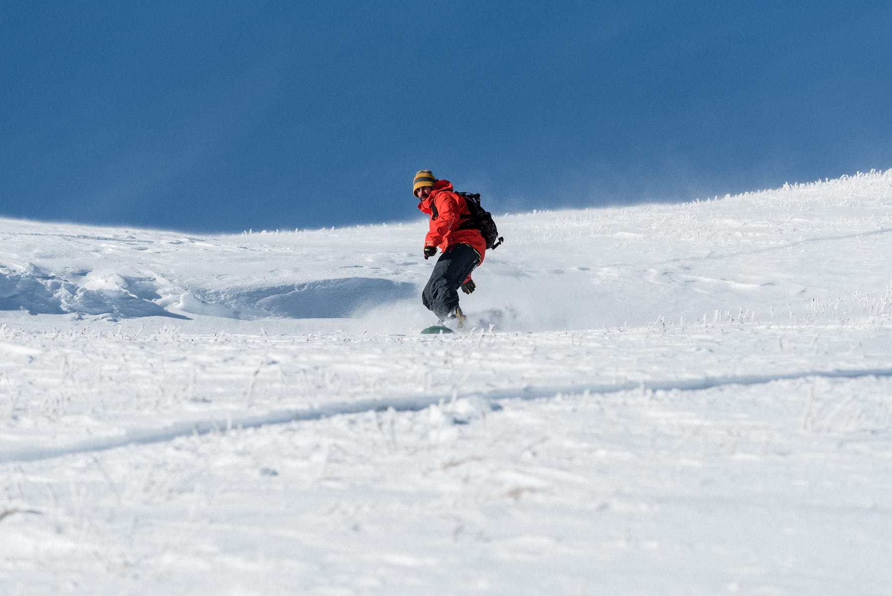 In spite of the occasional tuft of long grass poking through, the conditions were prime and the snow felt great. Like really great. As good as anything the Alps has to offer. With our boards strapped to our feet, the wind quickly became a distant memory and we were back to the bluebird conditions that had kept us company on the hike up.
