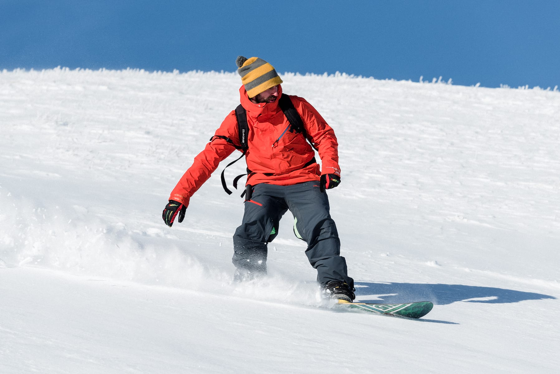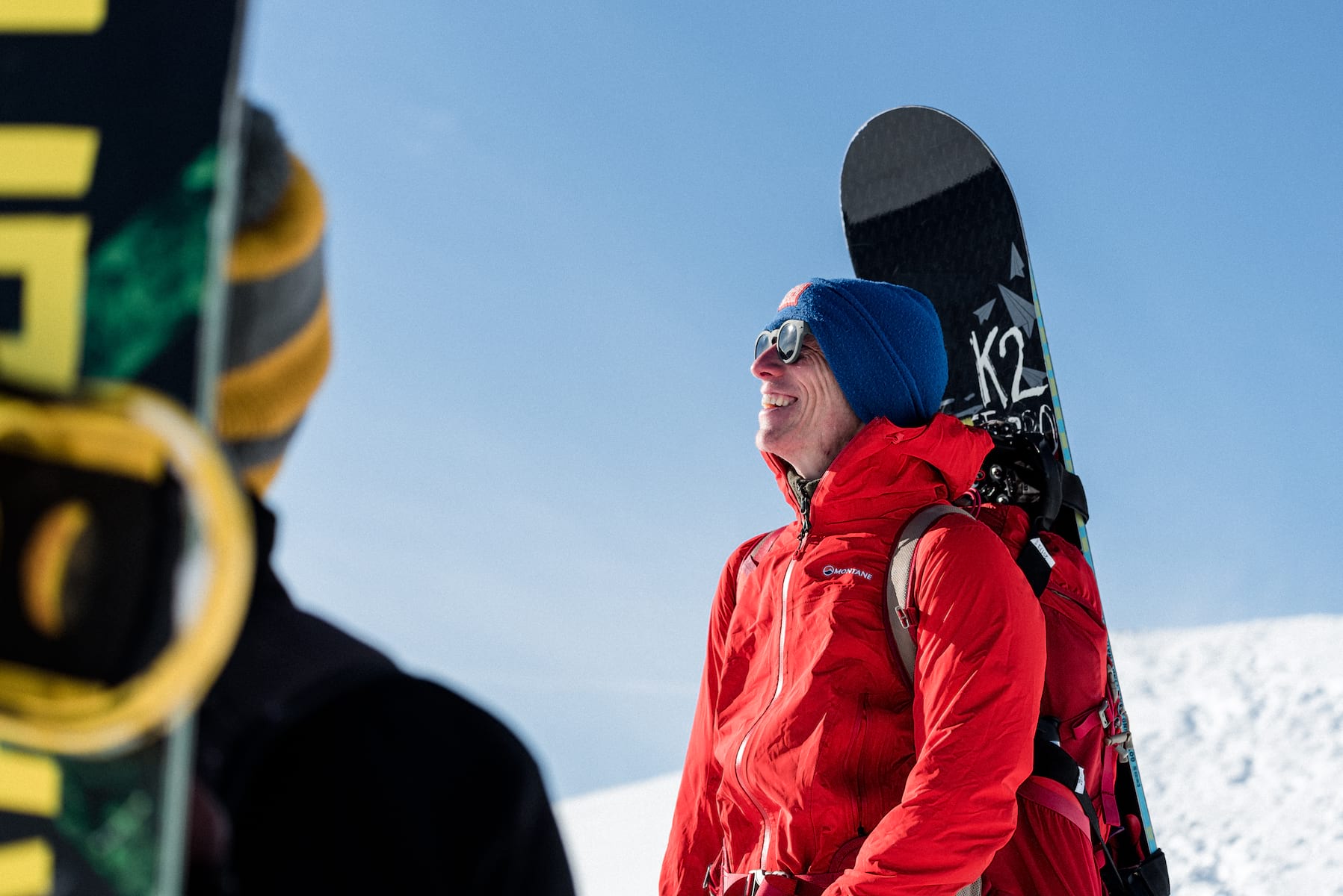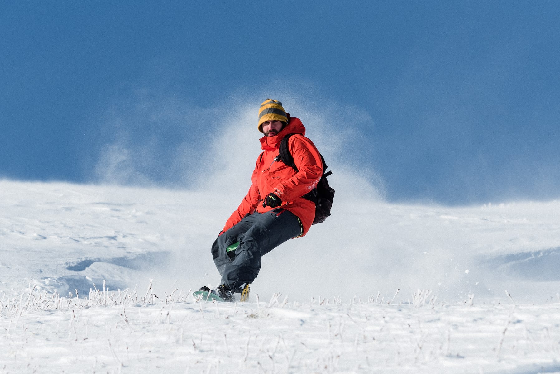 In spite of the occasional tuft of long grass poking through, the conditions were prime and the snow felt great. Like really great. As good as anything the Alps has to offer. With our boards strapped to our feet, the wind quickly became a distant memory and we were back to the bluebird conditions that had kept us company on the hike up.