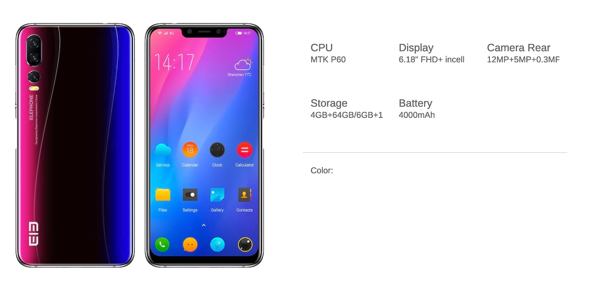 The Elephone A5 model we have on test features a Mediatek Helio P60 chipset, 4GB RAM and 64GB internal memory. Another model is also listed with a boost to 6GB RAM and 128GB internal memory with the same chipset.